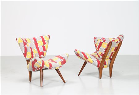 Lotto 81 GIORDANI PIERLUIGI Coppia di poltroncine in noce e tessuto, anni 50°. -. Cm 68,00 x 78,00 x 68,00.