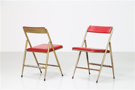 Lotto 83 PONTI GIO' (1891 - 1979) Coppia di sedie pieghevoli in tubolare di ferro laccato, seduta imbottita con copertura in resinflex, poggiapiedi in metallo disegnate, per Cagliani & Marazza anni '50. Pubblicazioni; Domus num. 344 luglio 1958 pag. 84, Domus num. 352 marzo 1959 pag. 86 . -. Cm 51,00 x 84,00 x 51,00.
