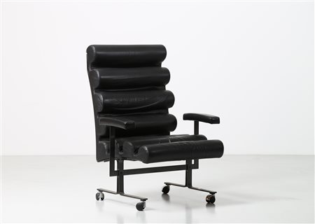 COLOMBO JOE (1930 - 1971) Crhomed steel strap armchair, sitting and seatback with alastic rollers covered by leather, unique prototype with wheels of the mod. Roll, Sormani’s production, 70’s, there is the Sormani Como’s certificate of authenticity. Literature; Domus num. 421, december 1964, pag. 120/121. . . Cm 80,00 x 115,00 x 85,00. -
