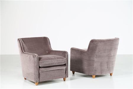 Lotto 97 PONTI GIO' (1891 - 1979) Coppia di poltrone in legno e tessuto, utilizzata per gli arredi del Transatlantico Conte Grande e Rettorato Università di Padova, anni 40. Sotto il rivestimento è presente il tessuto originale. Expertice a cura di Salvatore Licitra Archives Gio Ponti Milano. . -. Cm 75,00 x 80,00 x 87,00.