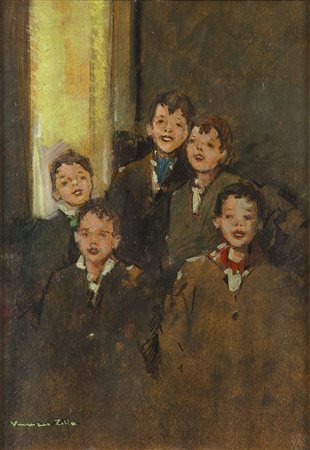 ZOLLA VENANZIO GB 1880 - 1961 Torino "Il coro di Lanzo" 34,5x24,5 olio su cartone Opera firmata in basso a sinistra