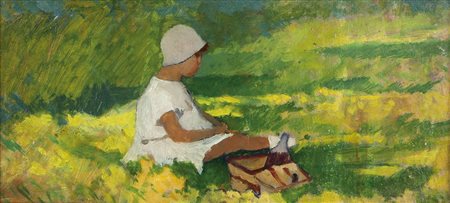 MALESCI GIOVANNI Vicchio di Mugello (FI) 1884 - 1969 Milano "Bimba sul prato" 1919 13,5x29 olio su tavoletta Già Galleria Berman, Torino (etichetta al retro)