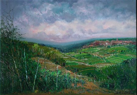 MANFREDI SERGIO Torino 1932 "Colline presso Albugnano" 35x50 olio su cartone Opera firmata in basso a destra e al retro col titolo Già Galleria Fogliato, Torino (etichetta al retro) Etichetta dell'Atelier dell'artista al retro dell'opera