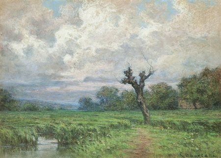UBERTALLI ROMOLO Mosso Santa Maria (VC) 1871 - 1928 "Paesaggio con albero" 51x66 pastelli su carta Opera firmata in basso a destra