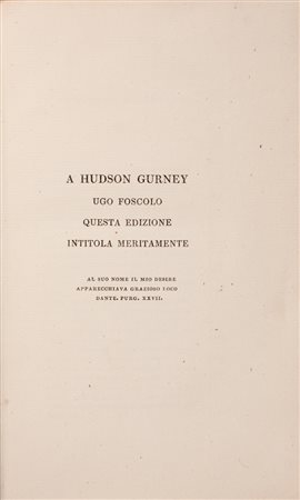 Edizione originale quasi introvabile di cui si conservano solo 3 copie nelle biblioteche italiane: in più, gli esemplari dell'edizione che come il nostro recano le tre carte cassate dall'editore, poiché mai posti in commercio, sono considerati una vera rarità bibliografica (Acchiappati 123); le tre carte di cui prima - qui presenti - sono il frontespizio generale (a cui ne segue un secondo con il titolo Discorso sul testo e sulle opinioni diverse prevalenti intorno alla storia e alla emendazione critica della Commedia...), l'occhietto e il prospetto dell'opera. «Questo tomo primo [...] fu in realtà l'unico a vedere la luce in causa di difficoltà insorte che condussero ad una protratta diatriba con l'editore»; essendo già stato stampato quando era divenuta ormai chiara al Pickering l'impossibilità di continuare la collaborazione con Foscolo per questa sfortunata collana, «per evitare di pubblicizzare l'insuccesso dell'iniziativa, l'editore fu costretto a privare il volume delle tre carte iniziali recanti l'occhietto, il frontespizio generale dell'opera e il prospetto dell'edizione e pose in commercio il Discorso sul testo di Dante come opera a sé» (Acchiappati 123). Si vedano anche Brunet II, 19; De Batines 162; Lowndes I, 589; Mazzolà 51; Ottolini 355. -