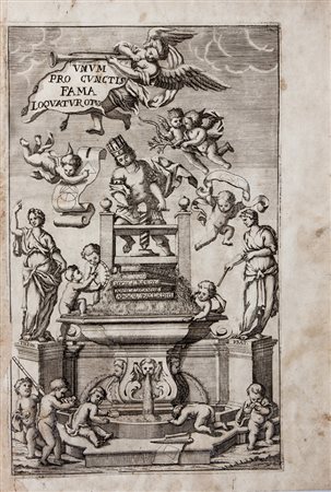 2 parti in 1 volume in-4° (mm 238x170). Pagine [14], 124 [i.e. 424] con 1 tavola allegorica incisa in rame fuori testo da Aliprando Caprioli; [16], 179, [1]. Due grandi vignette calcografiche ai frontespizi. Esemplare stampato su carta forte, con un'ampia ma lieve gora d'acqua nel margine esterno delle carte, più evidente in circa 20 fogli centrali, ma nel complesso buono. Legatura coeva in piena pergamena con titoli manoscritti al dorso con unghiature; punte e parte del dorso ricostruiti in pergamena moderna e sguardie rinnovate.