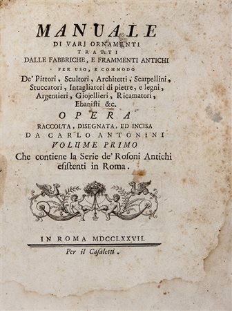 Lotto 1069 Antonini Carlo, Manuale di varj ornamenti tratti dalle fabbriche, e frammenti antichi per uso, e commodo de' scultori, pittori, architetti, scarpellini [...]. Volume primo (-quarto).