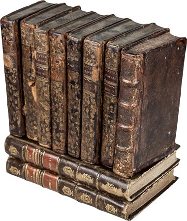 7 volumi in-8° (mm 140x80). Esemplare completo e in buono stato di conservazione, in legatura coeva in pieno vitello maculato. Difetti alle cerniere ed evidenti spellature ai piatti e ai dorsi. Due diversi timbri di collezione privata agli occhietti e una nota di possesso manoscritta. SI AGGIUNGE: Bonnet Charles, La palingénésie philosophique, ou Idées sur l'état passé et sur l'état futur des êtres vivans [...]. Tome premier (-second). A Munster: chez Philippe Henry Perrenon, 1770. 2 volumi in-8° (mm 170x95). Pagine XXIV, 368; [10], 388. Bruniture e fioriture sparse, a volte intense, e una minuscola mancanza nell'angolo inferiore di circa 50 carte. Legatura coeva in mezza pelle con difetti. Ex-libris R.B. Schmitz al verso del frontespizio e Dorbon-Ainé al contropiatto posteriore. SI AGGIUNGE: La Belliere Claude de, La physionomie raisonnée... A Paris: chez Edme Couterot, 1664. In-12° (mm 130x70). Pagine [24], 235, [5]. Lievi arrossature sparse. Legatura coeva in pieno vitello, con restauri al dorso e alle cerniere. Ex-libris Garrugues applicato al contropiatto e altra nota di possesso manoscritta. (10)