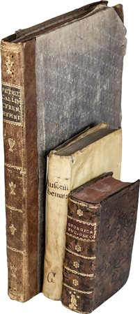 In-8° (mm 162x102). Pagine [16], 289, [13]. Ritratto dell'Autore in ovale al frontespizio. Ampia gora d'acqua lavabile nel margine inferiore delle carte. Legatura coeva in pergamena floscia. SI AGGIUNGE: Falconia Proba Petronia, Centonae. Vatis clarissimae. a divo Hieronymo. comprobatae. centonam. de. fidei nostrae. miisteris (sic!) e Maronis carminibus excerptum opusculum. (Al colophon:) Impressum in Lugdunensi ciuitate: in officina Bernardi di Lescuyer, 1516. In-8° (mm 156x86). Carte [16]. Grande marca dello stampatore incisa in legno in fine. Arrossature marginali. Cartonato moderno. SI AGGIUNGE: Hesiodus, Ta sozomena ton palaiotaton poieton Georgika Boukolika, kai Gnomika... S.l. [ma Ginevra]: Para E. Ouignoni, 1584. 2 parti (di 3) in 1 volume in-16°. Pagine [32], 159, [1]; [8], 410, [14]. La seconda parte ha proprio frontespizio e contiene Theokritou tou Syrakousiou Eidyllia kai Epigrammata. Simmiou Rodiou, Moskou Syrakosiou, Biōnos Smyrnaiou... Testo in greco. Arrossature lievi e taglio al frontespizio a cancellare una nota di possesso. Legatura settecentesca in pieno vitello maculato. SI AGGIUNGE: Callimachus, Hymni in latina carmina conversi... Romae: Typis Propaganda Fide Apud Franciscum Bourliè, 1818. In-4° (mm 270x210). Pagine XL, 181, [1]. Internamente bella copia ma con il piatto anteriore slegato. Legatura coeva, lisa. (4) -
