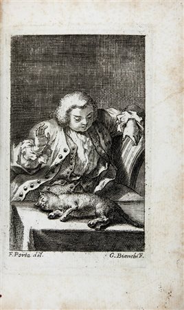 In-12° (mm 166x100). Pagine XXXX, 223, [1], 62, [10] con 1 tavola incisa in rame da Gaetano Bianchi su disegno di Ferdinando Porta raffigurante l'Autore con il proprio gatto. Ornamenti tipografici nel testo e marca dello stampatore in fine incisi in legno. Qualche piccola mancanza di carta marginale senza perdite di testo, fioriture sparse e aloni ma buona copia. Legatura coeva in pergamena rigida con titolo impresso in oro al dorso. Timbro con ex-libris Nicolai Parini al foglio di guardia anteriore.