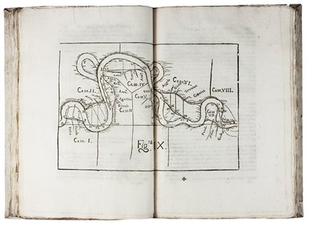 Non comune edizione originale di questo importante studio sui fiumi, sui corsi naturali e sulle opere d'acqua artificiali pubblicato in due parti a distanza di 7 anni e considerato il primo trattato di geografia idraulica. Ingegnere-architetto, Barattieri «è colui che per la prima volta si è posto il problema di descrivere cosa sia un fiume, come ci si debba comportare per difendersi dalla sua irascibilità e difenderlo dalla sua stessa forza, come poter sfruttare al meglio la sua presenza» (Motta-Pizzigoni-Ravagnati); l'opera è particolarmente ricercata anche per le belle figure che accompagnano il testo e illustrano i fenomeni di corrosione delle rive, di formazione di alluvioni e di isole fluviali, le inondazioni ecc. Fra le tavole si segnalano due figure a doppia pagina con il corso del Po e immagini dell'Arno e del Serchio. Cfr. Graesse I, 288; Riccardi I, 73: «Questa opera del Barattieri è una delle più apprezzate nell'idraulica pratica [...]. Le due parti riunite di questa edizione sono difficili a rinvenirsi»; Singer III, 315: «the best example in our period of a practical and scientific work on the problems of river regulation».
