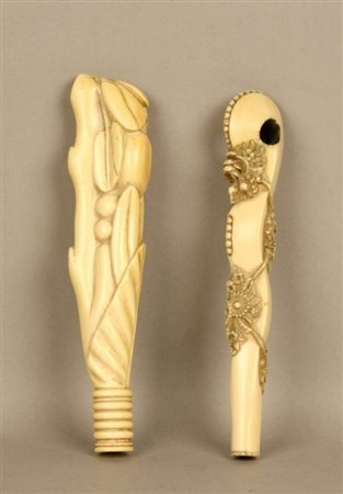 Lotto 2 Firmato, datato. Due manici da ombrelli in avorio. Fine XIX secolo. Mis. Alt. cm. 16 ca.