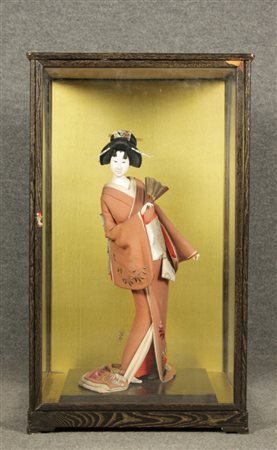 Lotto 5 Firmato. Geisha con mani e piedi in bisquit e vestito in tessuto ricamato. Giappone. XX secolo. In teca. Mis. Alt. cm. 53 ca.