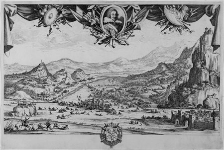 Lotto 13 Callot Jacques LA BATTAGLIA DI AVIGLIANA. 1630 Acquaforte. mm 354x530. Lieure, 663. Foglio di capitale importanza nella produzione dell’incisore lorenese, raffigura una scena dell’assedio del 1630 alla cittadina di Avigliana ad opera delle truppe francesi; in alto l’effigie del Marchese d’Effliat le cui armi sono rappresentate in basso. I stato su 2 classificato da Lieure R.R.R. (extrêmement rare). Ottima impressione stampata con inchiostrazione e definizione degli sfondi su carta vergellata. Margini di 3/4 mm oltre l’impronta della lastra su tre lati e di 1 mm al margine inferiore, un piccolo strappo senza mancanze all’angolo inferiore destro furi dalla parte incisa.