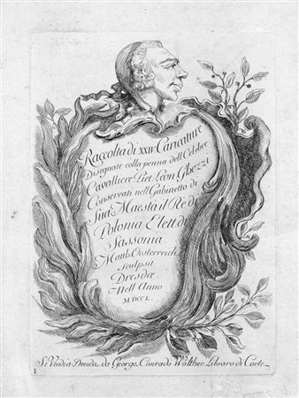 Lotto 23 da Ghezzi Pier Leone RACCOLTA DI XXIV CARICATURE DISEGNATE COLLA PENNA … 1750 Album in-folio grande contenente la rara serie completa ed omogenea di 24 tavole incise all’acquaforte da Matthias Oesterreich a Dresda nel 1750 e ivi pubblicata da Georg Conrad Walther, dai disegni di Ghezzi conservati presso il Gabinetto del Re di Polonia Elettore di Sassonia. L’album comprende ulteriori 10 tavole incise all’acquaforte e 1 alla ceramolle da Arthur Pond da disegni di Ghezzi, Annibale Carracci, Watteau e Maratta datate fra il 1722 ed il 1741. Bellissime impressioni stampate su carta vergellata spessa. Grandi margini, un’ abrasione esterna alla parte incisa nella prima tavola, lievi tracce d’uso. Legatura in mezza pelle e tela con leggere spellature.