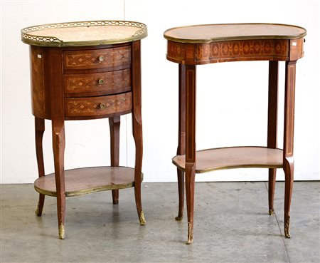 Lotto di due mobiletti servant filettati e decorati da piccoli intarsi, uno con piano in marmo, finiture in metallo (difetti)