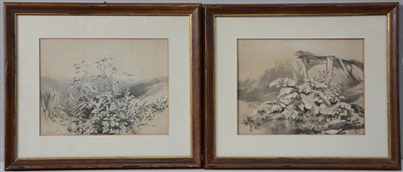 Firma indecifrata, coppia di stampe monocrome raffiguranti paesaggi con piante e fiori in primo piano (cm 28x37) in cornici
