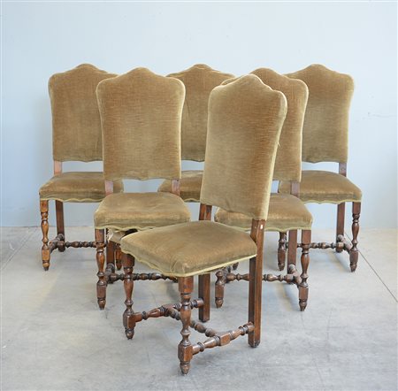 • Gruppo di sei antiche sedie imbottite con gambe tornite a rocchetto,...