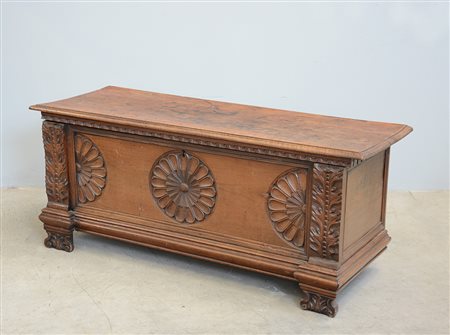 Cassapanca in noce con montanti intagliati a motivi vegetali, fronte decorato con rosone centrale (cm 133x55x49)(difetti)