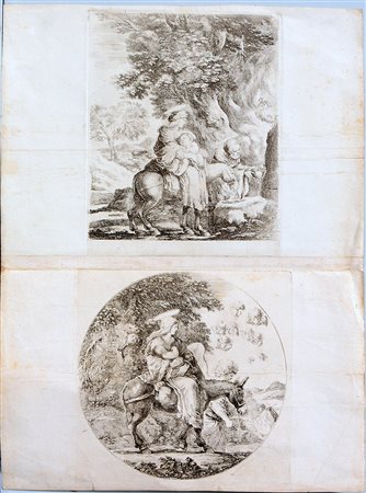 Stefano della Bella (Firenze 1610-1664) Due acqueforti raffiguranti "La fuga in Egitto" su un unico foglio (mm 488x365 il foglio) (difetti)