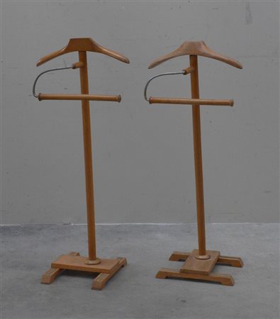 Coppia di servomuti in legno e metallo, uno stampigliato "L'indossatore". (difetti)