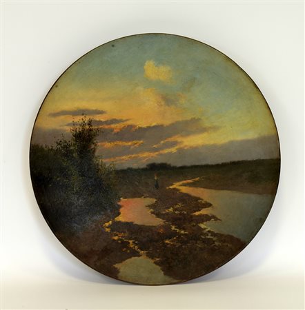 • Coriolano Vighi (Firenze 1852 - Bologna 1905)"Paesaggio al tramonto" piatto...