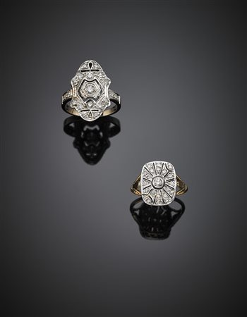 Lotto 1129 Lotto di due anelli in oro giallo, bianco e diamanti per complessivi ct. 0,60 circa, complessivi g 9,39 misura 12,5/52,5/16/56. Marcato 481 NA.