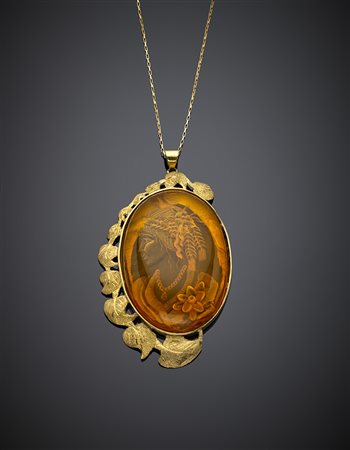 Lotto 1130 Pendente con catena in oro giallo, foglie cesellate satinate e al centro una grande ambra scolpita 6 x 4.2 mm, g 46,17, lungh. cm 40 circa.