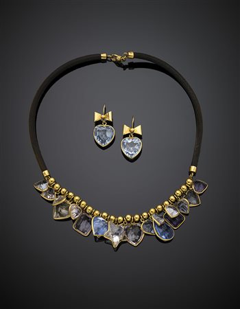 Yellow gold jewellery set comprising necklace and ear pendant, the first with variously hued and shaped quartz and a leather strap, the earrings with synthetic spinels, in all g 53.71. -