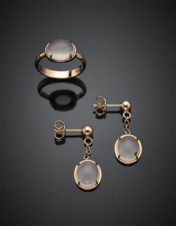 Pink gold Hyaline quartz jewelry set comprising a ring, size 11/51, and pendant earrings of cm 2.50, quartz in all ct. 8.50 circa, in all g 7.93. Marked 2297 MI. With original guarantee -