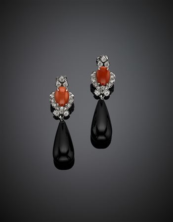 White gold orange oval coral and ruby white gold pendant earrings suspending two onyx drops, diamonds details, g 13.86, length cm 7.2 circa.