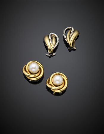 Lot of two pairs of bi-coloured gold pearl and diamond earrings, in all g 23.68. One marked 35 VA. -