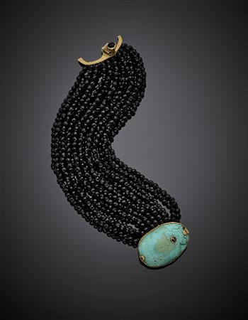 Bracciale multifili in boules di onice sfaccettata con chiusura in oro giallo e turchese a guisa di scarabeo, g 102,47. Firmato Melania Crocco gioielli.