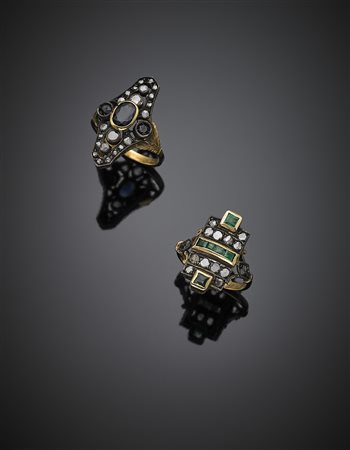 Lotto 1140 Lotto di due anelli in oro giallo, argento, diamanti, smeraldi e zaffiri, complessivi g 10,22 misura 14/54 18/58. Marcato 551 FI.