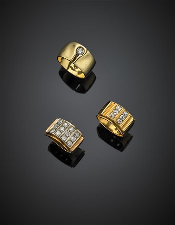 Lotto 1141 Tre anelli in oro giallo e diamanti di tagli diversi, complessivi g 23,06 misura 7/47 - 16/56.