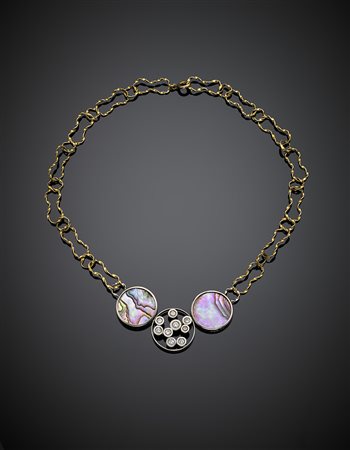 Yellow wrought gold chain with white gold, Haliotis mother-of-pearl and diamond central, in all ct. 0.80 circa, g 18.47, length cm 40 circa. Appended original 23/12/75 sale guarantee by Scavia Jewelry -
