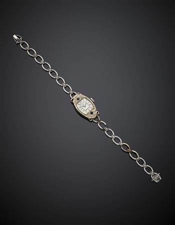 Platinum and diamond lady's wristwatch accented with small carré sapphire, dial with arabic numbers, g 17.23, length cm 17.50 circa. Marked 3039. -