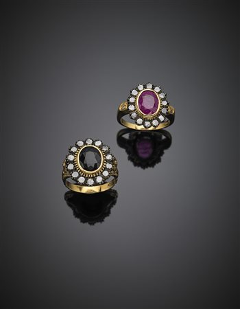 Lotto di due anelli in oro giallo e argento, zaffiro e rubino ovali, diamanti a mezza rosetta, complessivi g 12,76 misura 14/54. Marcato 2149 AL.