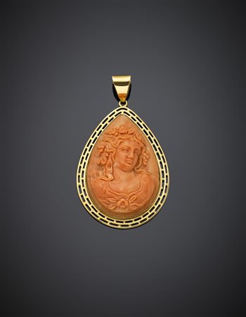 Pendente in corallo arancione scolpito con figura femminile e montato in oro giallo, g 19,05, lungh. cm 6, largh. cm 3,50 circa. Firmato R. Panariello.