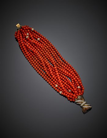 Lotto 1148 Bracciale multifilo in corallo con chiusura in oro rosso 585/1000 e diamanti per complessivi ct. 0,60 circa, dettagli in oro bianco, g 63,48, lungh. cm 21 circa.