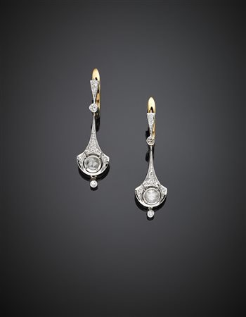 Orecchini pendenti in oro giallo e bianco con diamanti per complessivi ct. 1 circa, g 7,78, lungh. cm 4,7 circa. Marcato 439 NA.