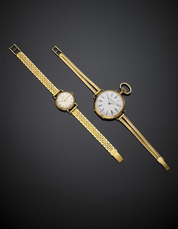 Lotto di due orologi in oro giallo con bracciali non firmati, il primo da tasca trasformato da polso con quadrante diam. 3.3 e lungo 18 cm, il secondo con il quadrante diam 2.3 e lungo 17.3 cm, complessivi g 69,63. Antoine frères marchi francesi,