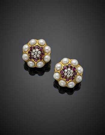 Diamond, pearl and ruby yellow gold stylized flower earclips, g 32.4, diam. cm 2.5. -