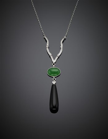 White gold chain with a diamond central suspending a micro crystalline green quartz, diamond and onyx drop pendant, g 12.21, length cm 48 circa. -
