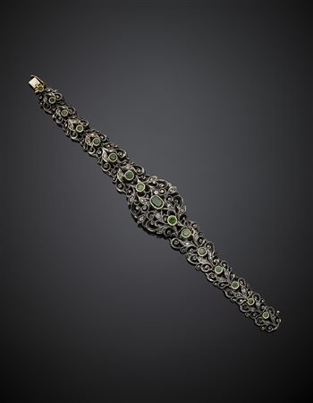 Lotto 1153 Bracciale modulare a disegno floreale in oro giallo e argento con diamanti a mezza rosetta e smeraldi per complessivi ct. 2,50 circa, g 34,39, lungh. cm 19,2 circa.