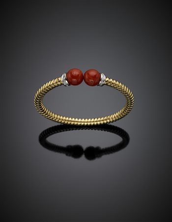 Lotto 1154 Bracciale elastico in oro giallo a tubogas terminato da boules di coralli e diamanti, dettagli in oro bianco, g 26,45, diam. cm 6.