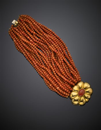 Bracciale multifili in corallo arancione con chiusura a fiore in oro giallo e corallo cabochon, g 97,75, lungh. cm 19,80 circa. Marcato 671 NA.