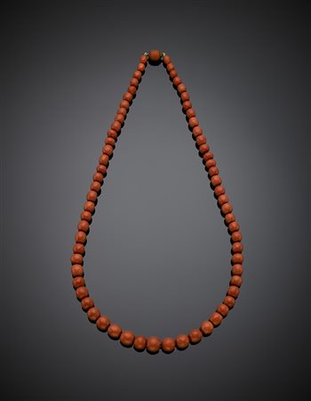 Orange coral faceted bead graduated necklace, bead diam. from mm 6.77 to mm 12.84, yellow gold clasp, g 91.20, length cm 67.50 circa.