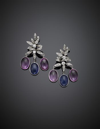 White gold diamond pendant earrings suspending two oval cabochon tanzanite and four pink synthetic corundums, diamonds in all ct. 1.70 circa, g 21.57, length cm 5, width cm 3.5 circa. -