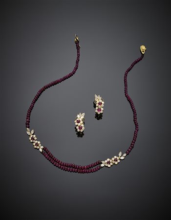 Jewelry set comprising a ruby bead cm 39 necklace with yellow gold ruby and diamond flower spacers and similar earclips, diamonds in all ct. 2 circa, in all g 23.89. Marked 26 AL. -